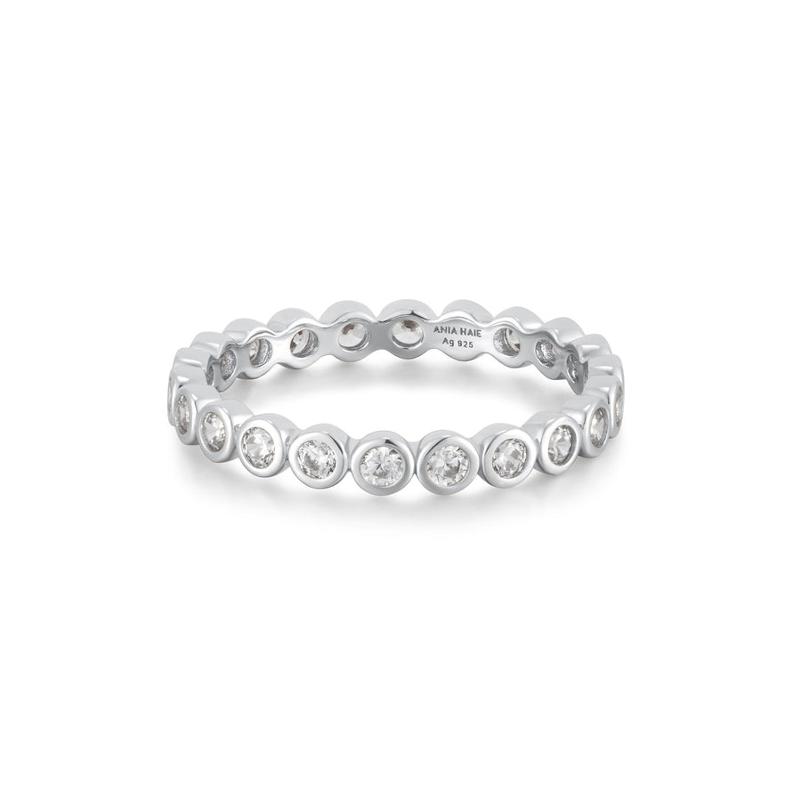 Designed to be a wardrobe essential, the bezel set ring features a band of cubic zirconia in rhodium plated sterling silver. It looks brilliant worn alone or stacked with yours, effortlessly suiting your everyday wear.