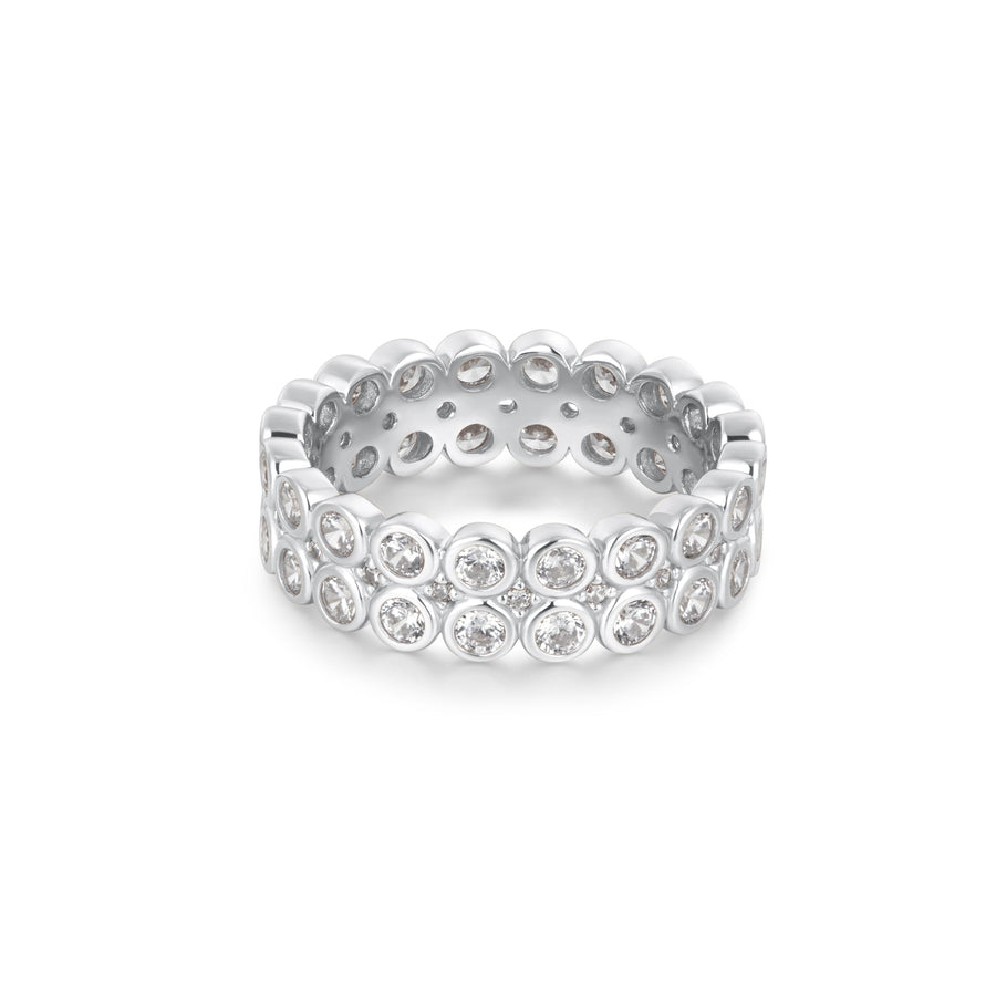 Set with double rows of glittering cubic zirconia in rhodium plated sterling silver, the stunning piece is sure to make a statement in any ring stack. Wear it alone or stacked with other pieces to create stunning styles.