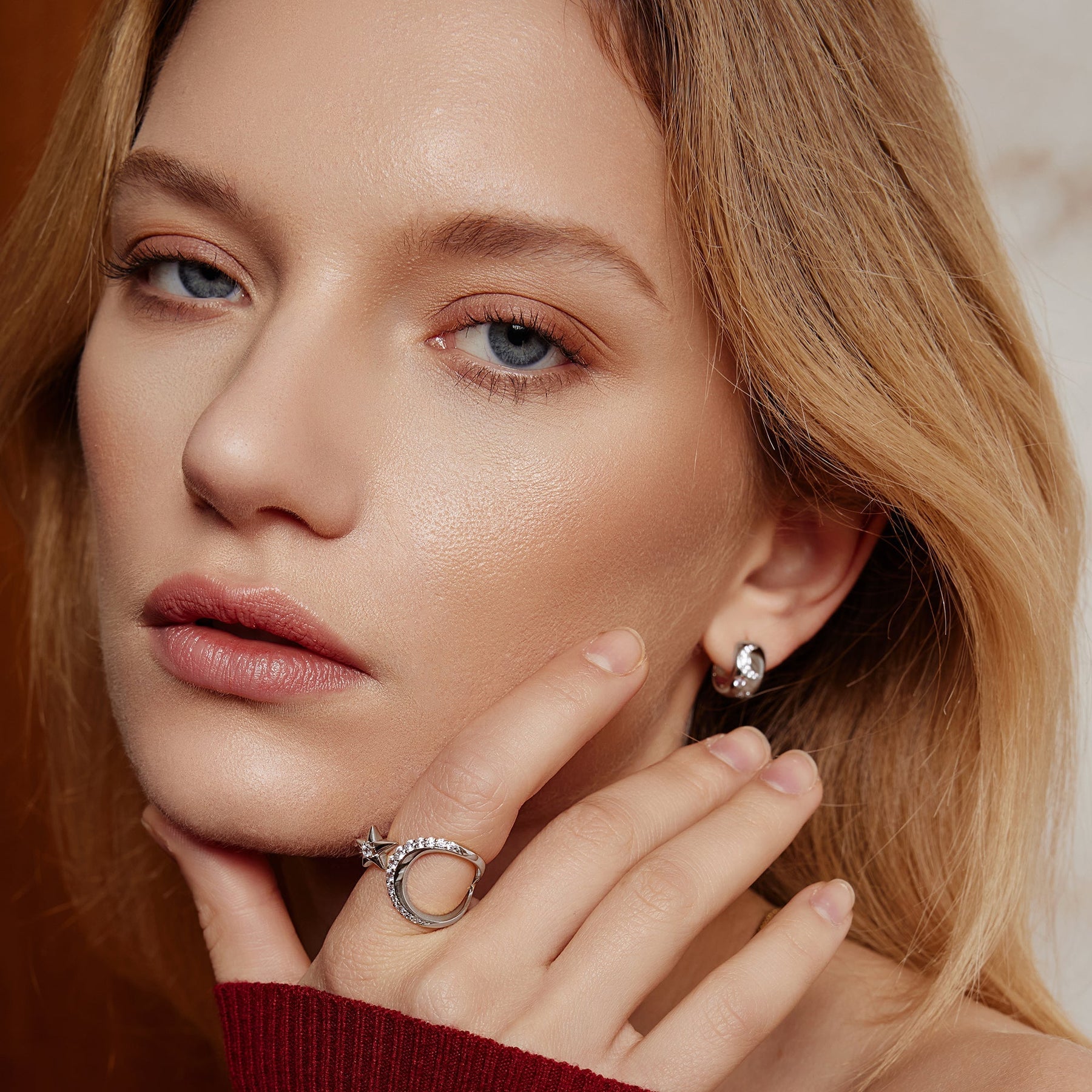 Dive into dreamy elegance and romance with this season's must-have jewellery! Inspired by celestial beauty, this brilliant ring features a sparkling moon and star, adding a touch of whimsical charm to your everyday look. Perfect for both casual and special occasions.